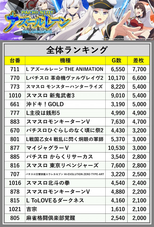 ※差枚数順に掲載しています