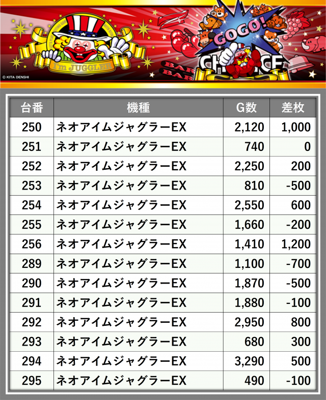 厳選された取材対象機種をはじめ、その他スロット全体から好記録が飛び出した!プレイヤーが楽しんだ1日を下記データにて振り返ってみて欲しい。