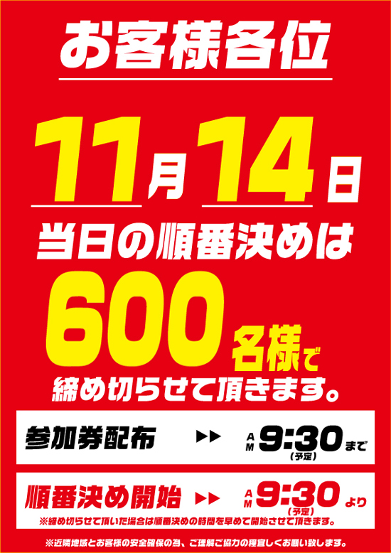 明日11月22日10時オープン 抽選は600名様で打ち切り