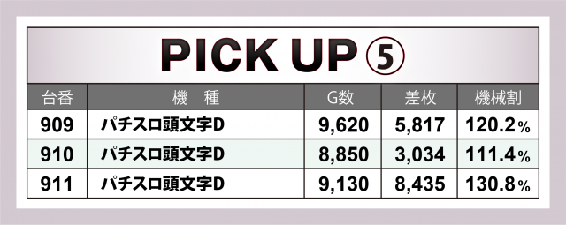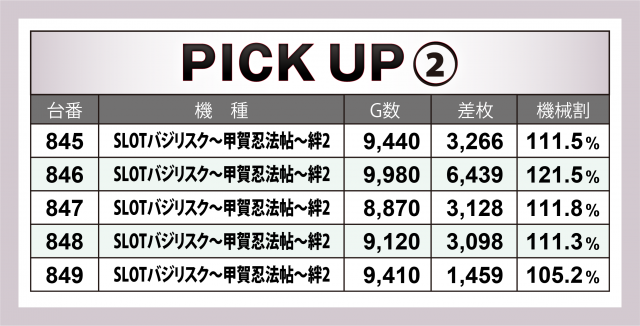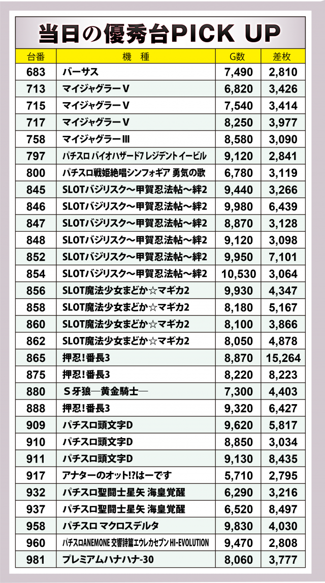 また当日は5機種の横並び好況スポットが出現。対象の全機種全台が差枚数プラスとなり、特に注目は『SLOTバジリスク~甲賀忍法帖~絆2』『パチスロ頭文字D』。前者は5台トータル&後者は3台4トータルで共に+1万7千枚を突破!