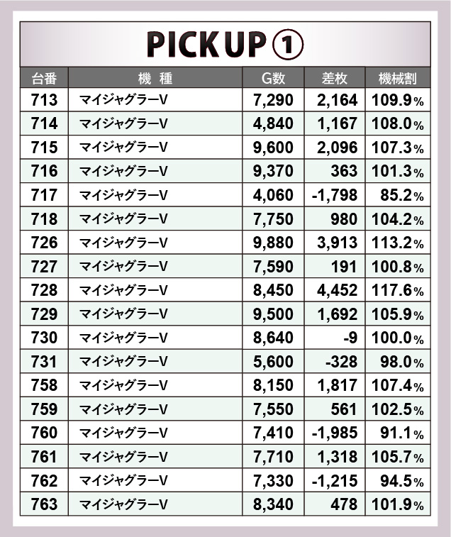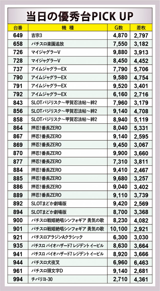 ピックアップされた優秀台30台をチェックすると、全台的に3千枚OVERが多発していたことが分かる。その中で新台『パチスロ犬夜叉』944番台+6,463枚という記録が発生し、他にも『アイムジャグラーEX』737番台+5,706枚や『押忍!番長ZERO』864番台+5,331枚のような熱量のある結果が目を惹く。また『パチスロ戦姫絶唱シンフォギア 勇気の歌』を筆頭に万回転到達台が見られるなど、全体的に打ちごたえのある内容だったと窺える。