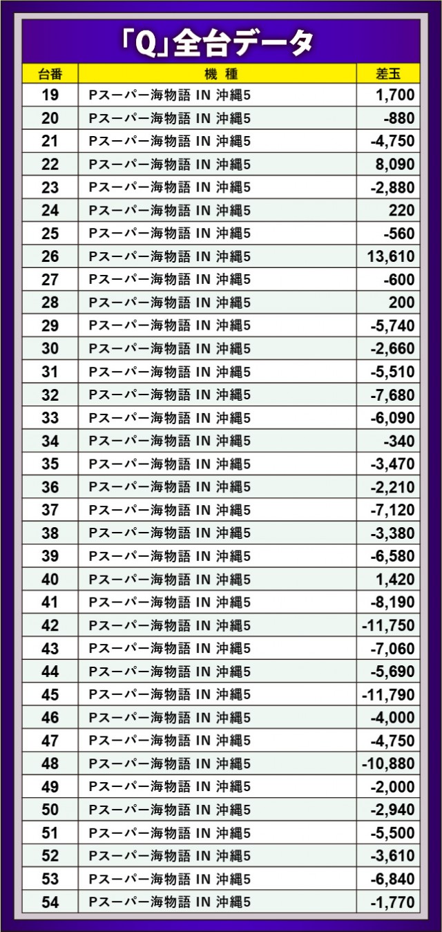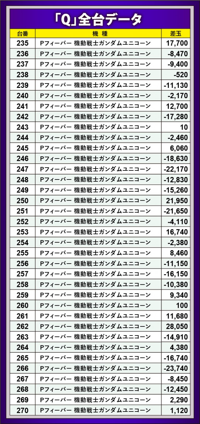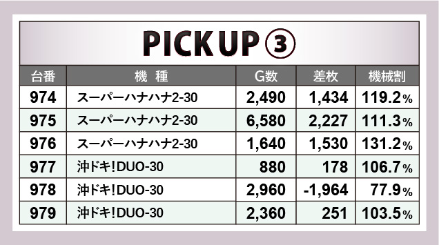『Pスーパー海物語 IN 沖縄5』『Pフィーバー 機動戦士ガンダムユニコーン』の島は活気に満ちていたが、熱気がなかなか上がらなかった状況だった。万発OVER台こそあるものの、全体的に大きくマイナスを記録してしまっている。235番台+17,700玉・262番台+28,050玉のような目立った活躍は、今後において希望を見出す光になったかもしれない。