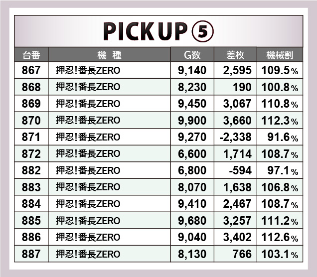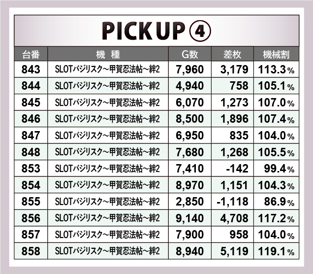 人気AT機『SLOTバジリスク~甲賀忍法帖~絆2』『押忍!番長ZERO』もまた、それぞれ2か所ずつの横並びスポットが形成されていた。やはり朝から閉店まで打ち込まれ、ファンは自信を持って遊技をできていたのが分かる。特に『SLOTバジリスク~甲賀忍法帖~絆2』では856番台+4,708枚・858番台+5,119枚の記録が見られ、同機種の盛り上がりを牽引する存在となっていた。