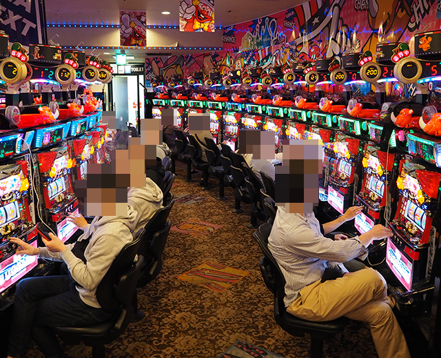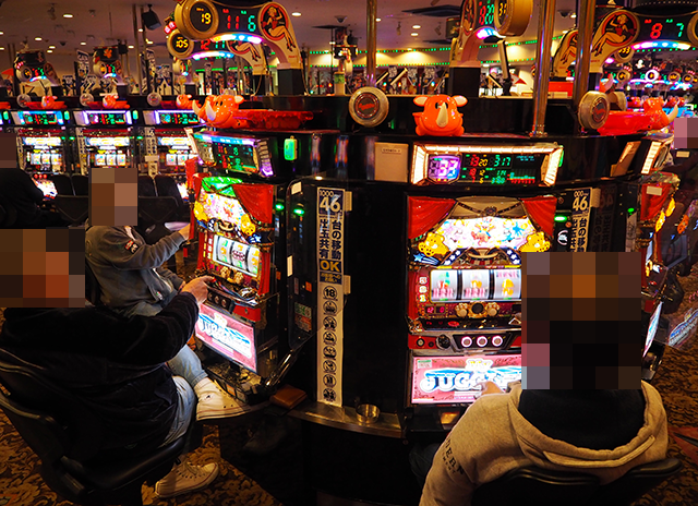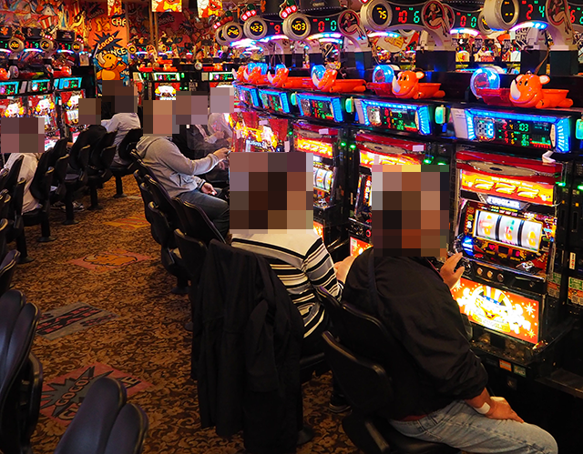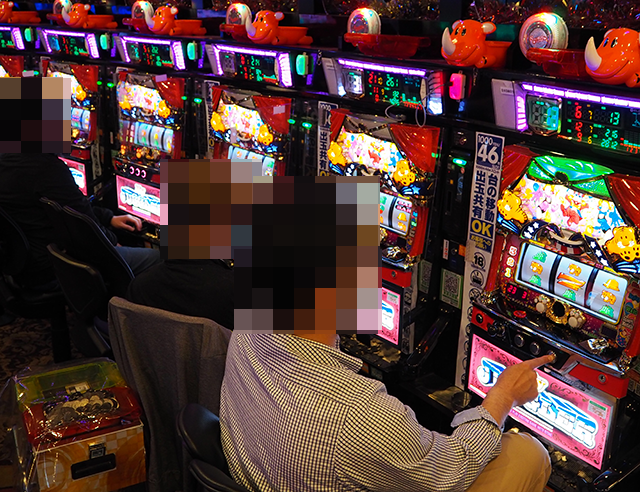 午後の店内はパチスロの活気が大きく、随所に遊技を満喫しているようなプレイヤーの姿があった。