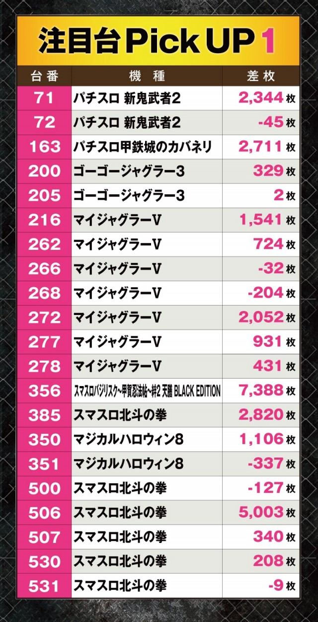 ほかにも『パチスロ 新鬼武者2』『パチスロ甲鉄城のカバネリ』『マイジャグラーⅤ』など+2,000枚オーバーの好調台が見られ、プレイヤーたちは充実した時間を過ごせていたようだ。
