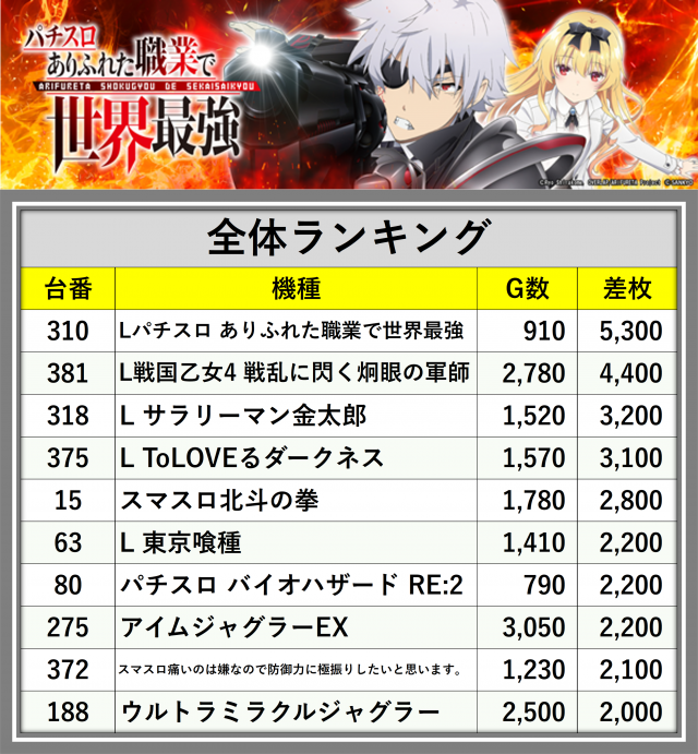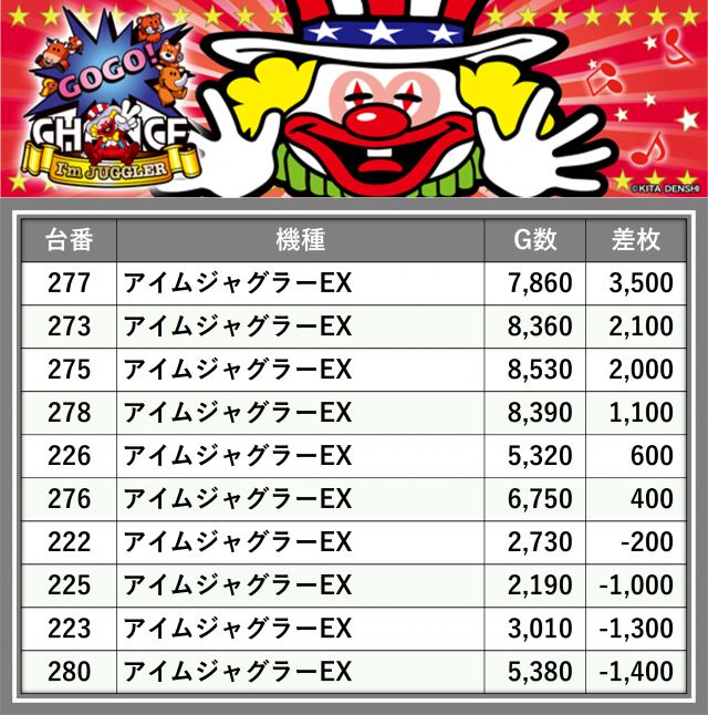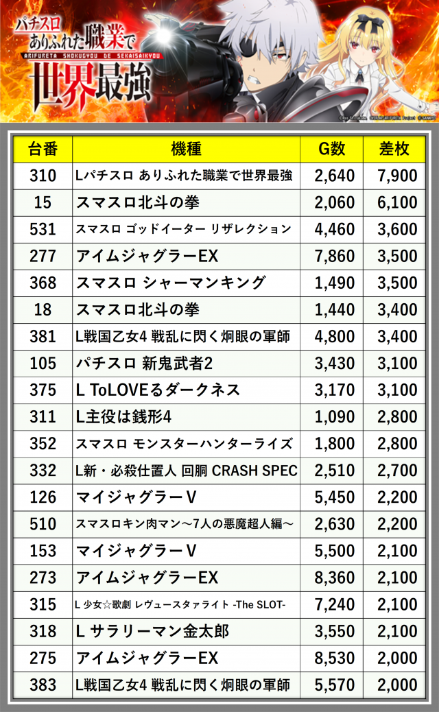 厳選された取材対象機種をはじめ、その他スロット全体から好記録が飛び出した!プレイヤーが楽しんだ1日を下記データにて振り返ってみて欲しい。