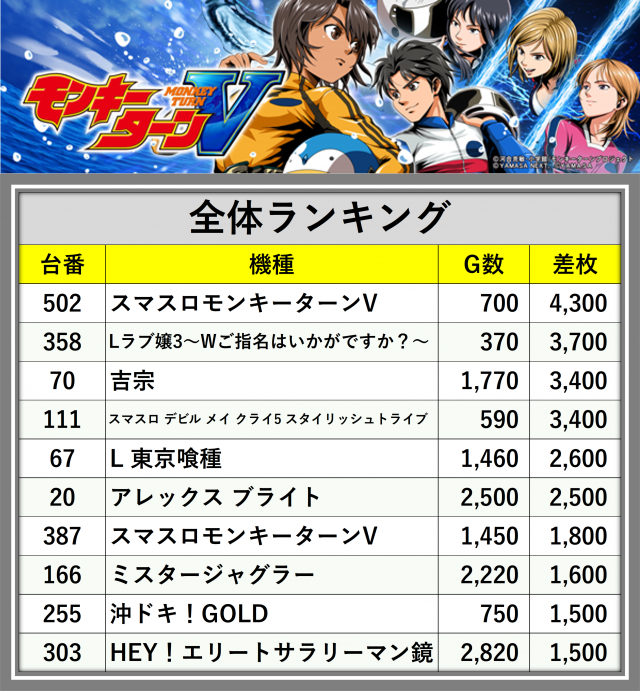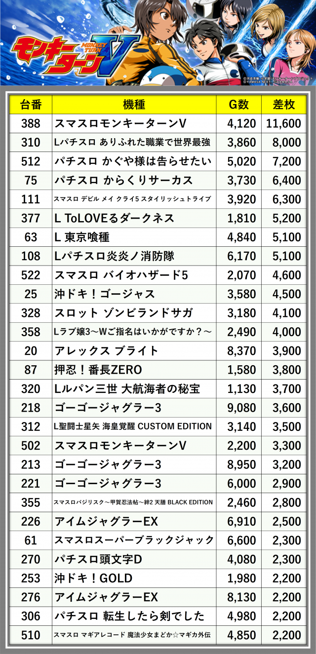 ※差枚数順に掲載しています