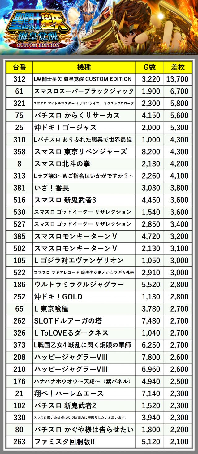 厳選された取材対象機種をはじめ、その他スロット全体から好記録が飛び出した!プレイヤーが楽しんだ1日を下記データにて振り返ってみて欲しい。