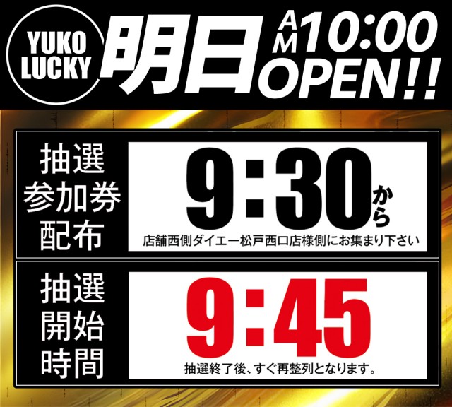 9:30~9:45まで抽選参加券を配付しております。★抽選開始 9:45★ ※パチンコ・スロット共通 |