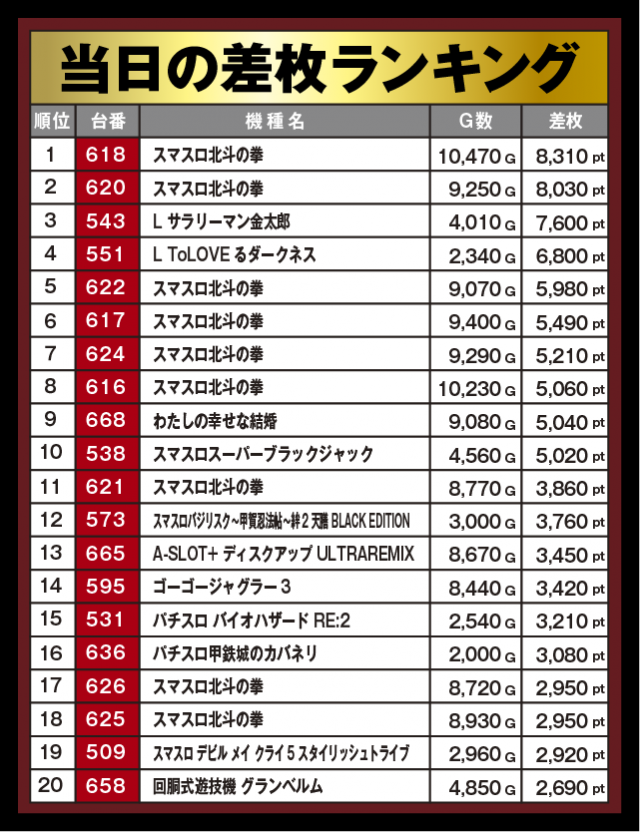 この日のSAPグループはひと味違う。DMMぱちタウンは、「SAP野田」の特別なひとときを一斉取材した。特に華々しい活躍を残した機種たちをピックアップして紹介しよう。まずは差枚ランキングの発表だ!