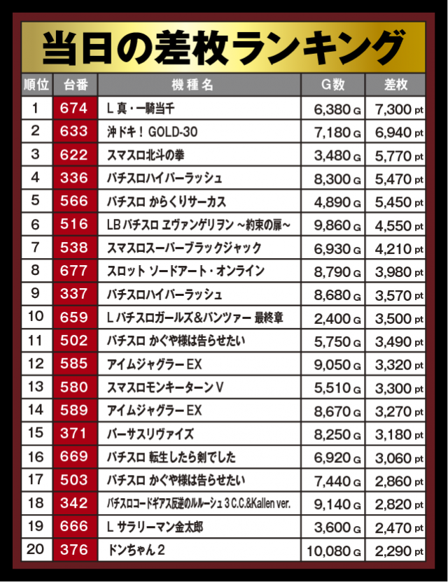 この日のSAPグループはひと味違う。DMMぱちタウンは、「SAP野田」の特別なひとときを一斉取材した。特に華々しい活躍を残した機種たちをピックアップして紹介しよう。まずは差枚ランキングの発表だ!