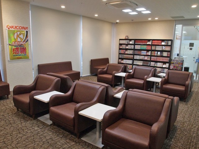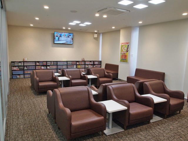 どちらも座ってみたい気持ちに駆られるゆったりソファを完備。さらに常時2000冊のコミックも備える。
