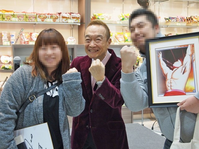 | 来店時には壇上で、ケンシロウ(北斗の拳)、キン肉スグル(キン肉マン)、冴羽リョウ(シティハンター)など人気アニメキャラクターの名セリフを披露。ファン一同を大いに盛り上げた。また、神谷明さん本人との記念写真撮影では自ら好きなアニメ画を持参するファンもいたほどだ。 | |