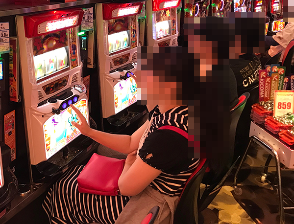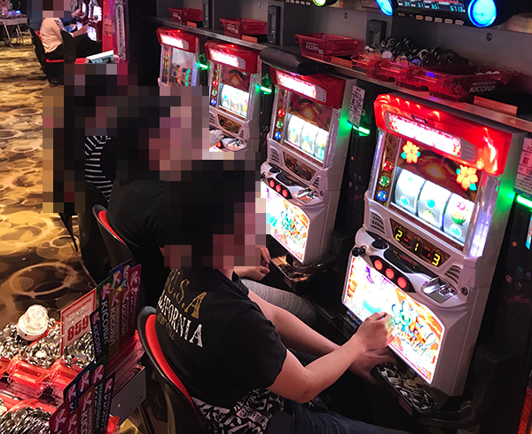 パチスロコーナーをみわたすと、各シマに華やかなシーンが多数。AT機やART機、ボーナスタイプなど、スペックを問わずに機種のポテンシャルを引き出すといった姿があり、みていて楽しい気分になった。