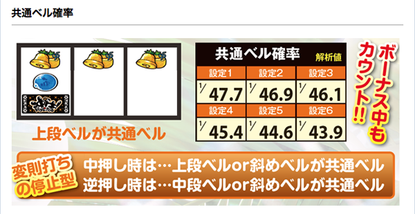 どの状態でもカウントできる共通ベルの確率にも設定差が存在する。サンプルを集めて設定推測に活かそう。