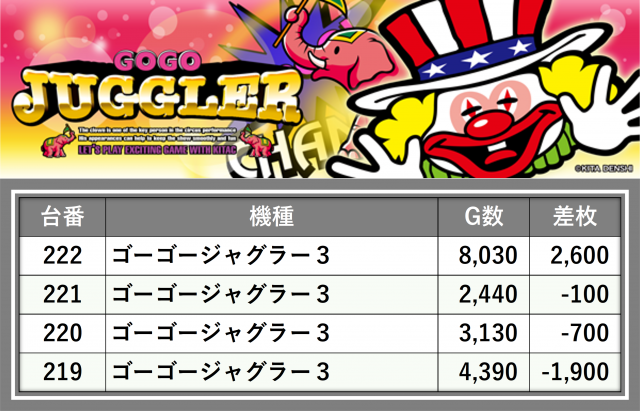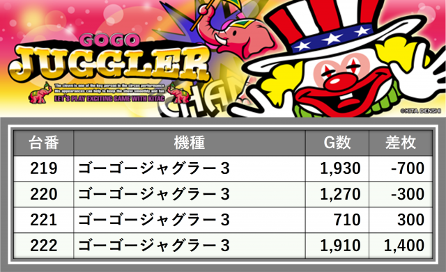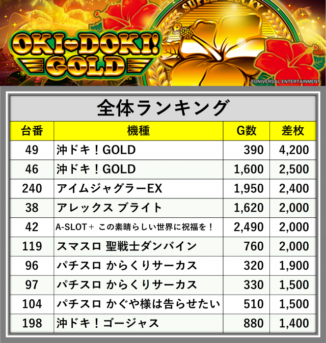 厳選された取材対象機種をはじめ、その他スロット全体から好記録が飛び出した!プレイヤーが楽しんだ1日を下記データにて振り返ってみて欲しい。