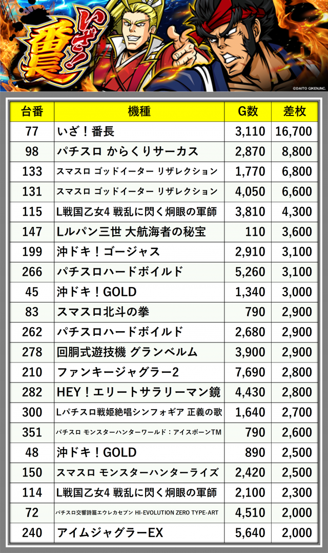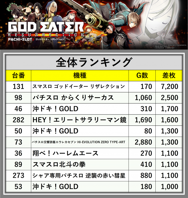 ※差枚数順に掲載しています
