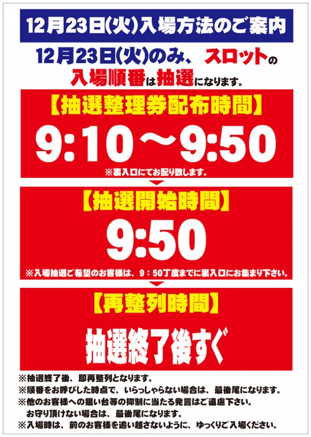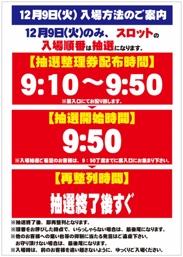 9:10に店舗出入り口付近にて入場順番券配布 |