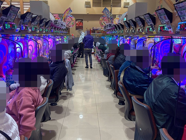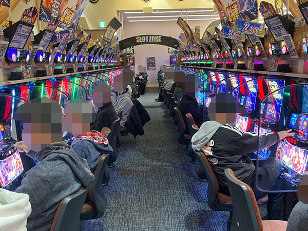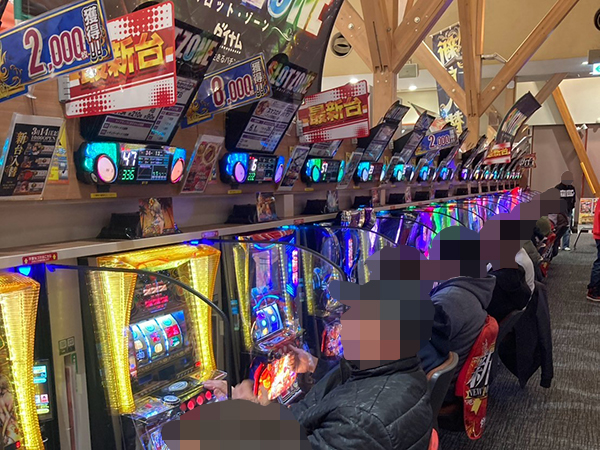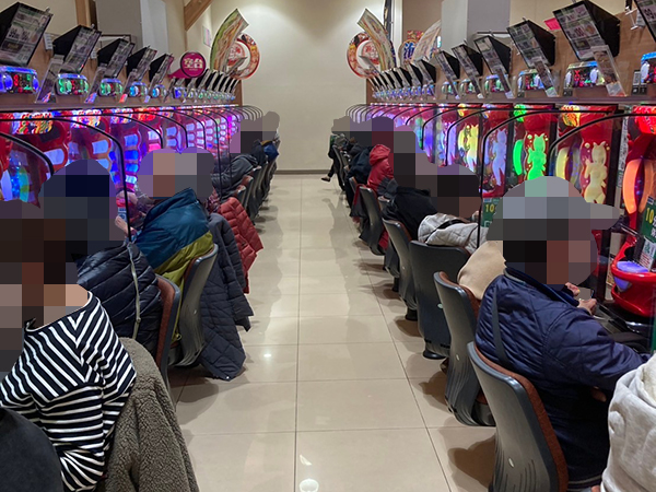 取材時は既に多くのプレイヤーが集結し、パチンコ・パチスロを問わずにぎやかな状況となっていた。