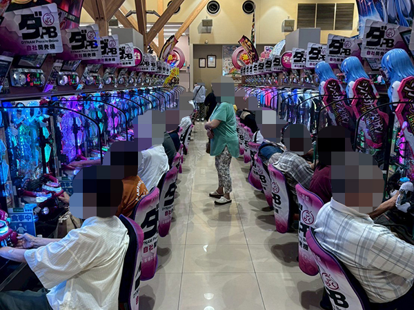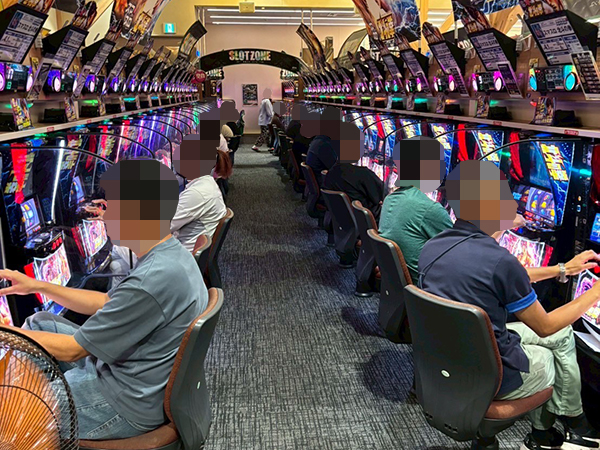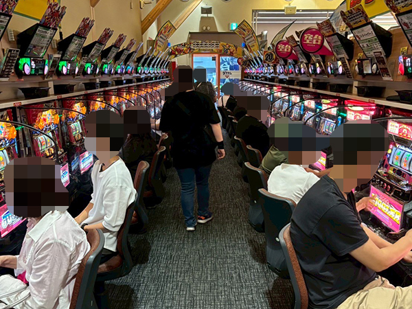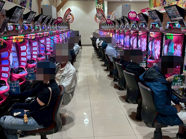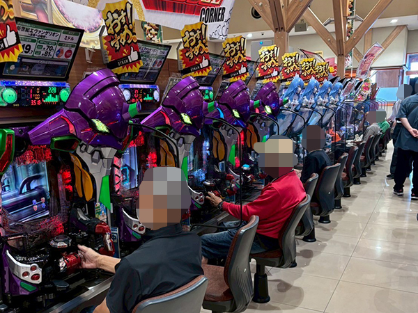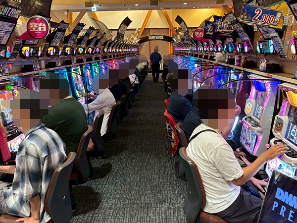 取材時は多くのプレイヤーが来店。パチンコ・パチスロともに、様々な機種が支持を得ていた。
