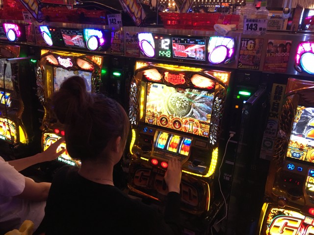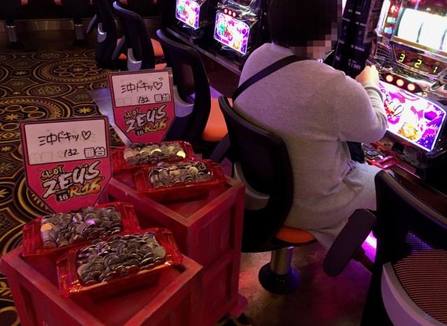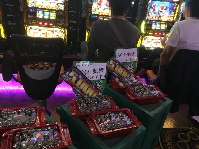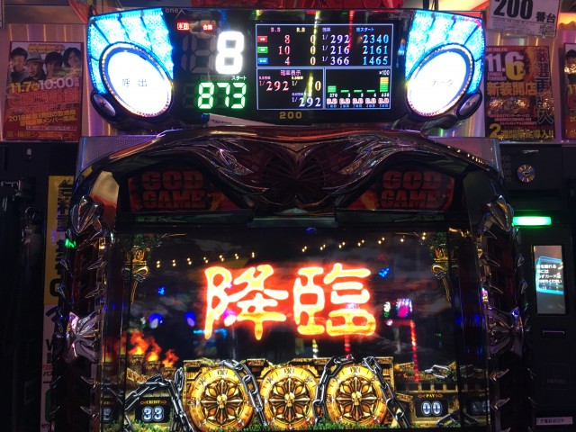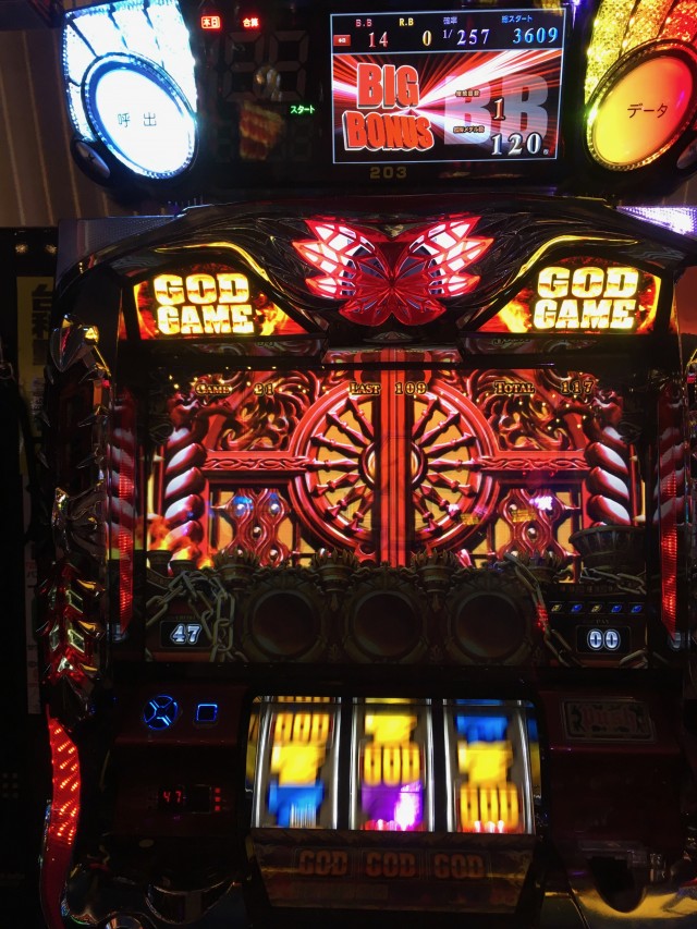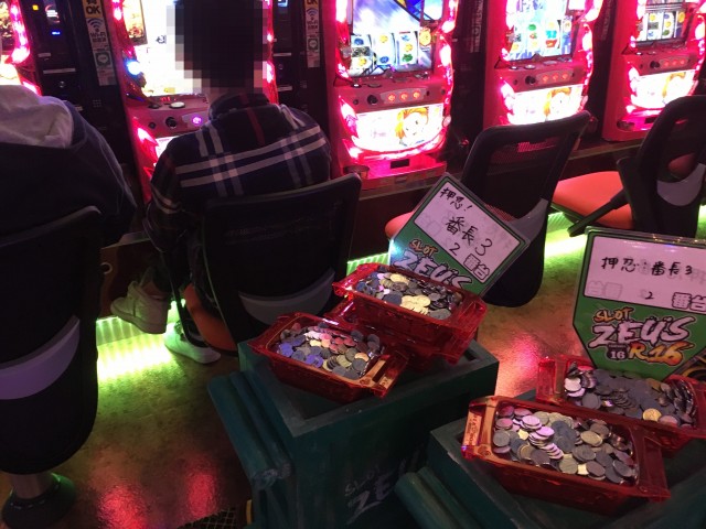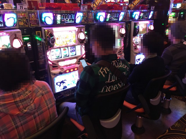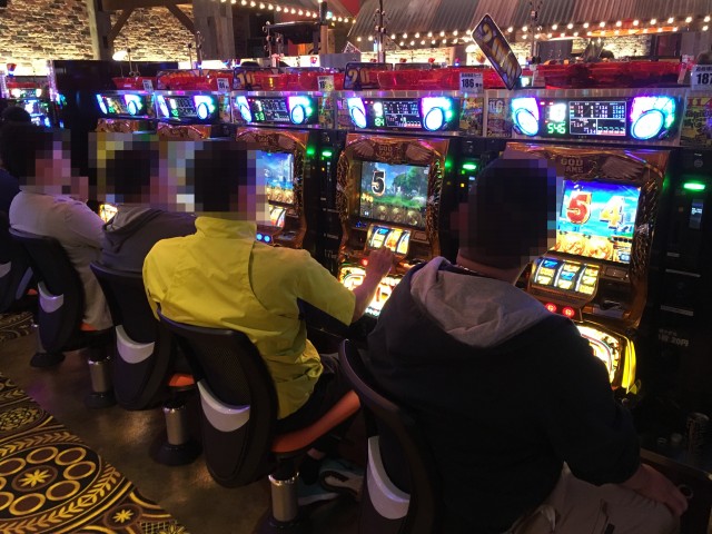 時刻はお昼すぎ。朝イチこそ空き台もあったが、この時間になると店内の活気はピークに達しており、移動は困難。ゴッドシリーズはもちろん、人気の「押忍!番長3」や「SLOT魔法少女まどか⭐︎マギカ」など大賑わい。