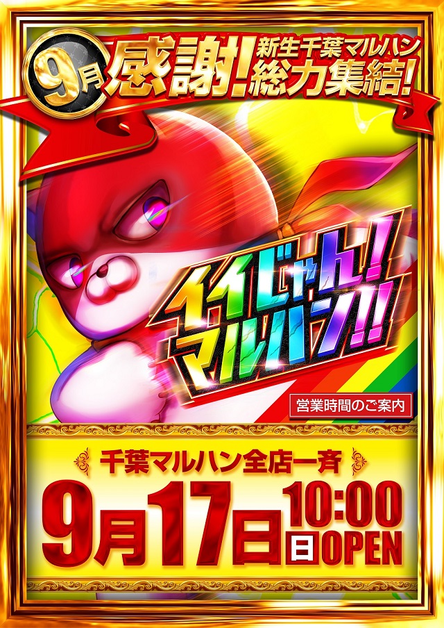 ✨✨9月❶❼日(日)千葉マルハン全店10時開店!✨✨