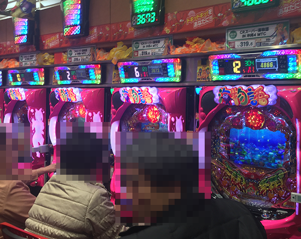 16時半をすぎる頃の4円パチンコでは、「CRスーパー海物語IN沖縄4」といった海物語シリーズが人気。