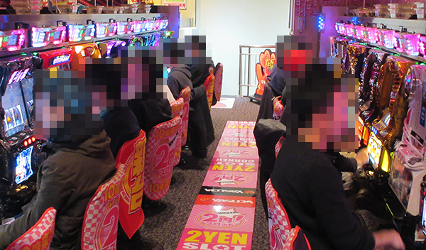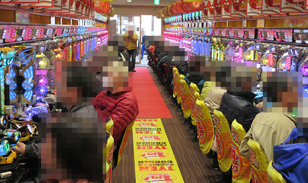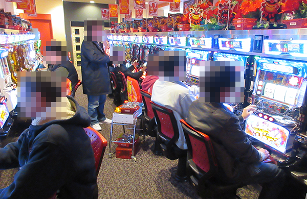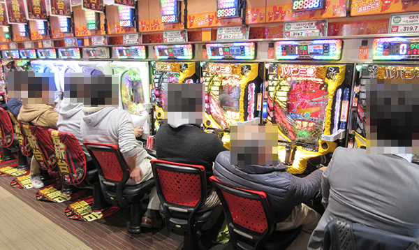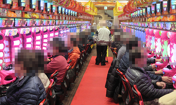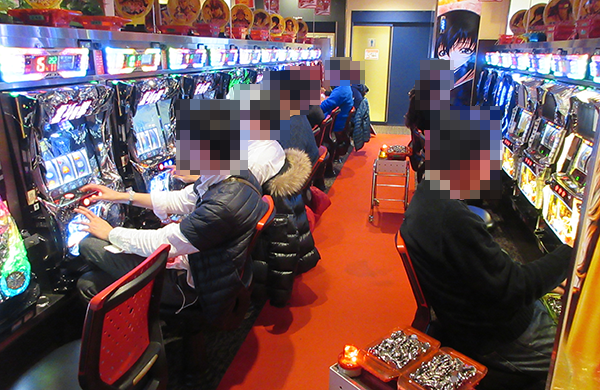 ホール内をのぞいてみると、パチンコ・パチスロともにたくさんのプレイヤーが遊技を楽しんでいた。