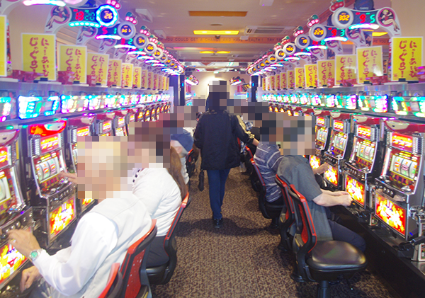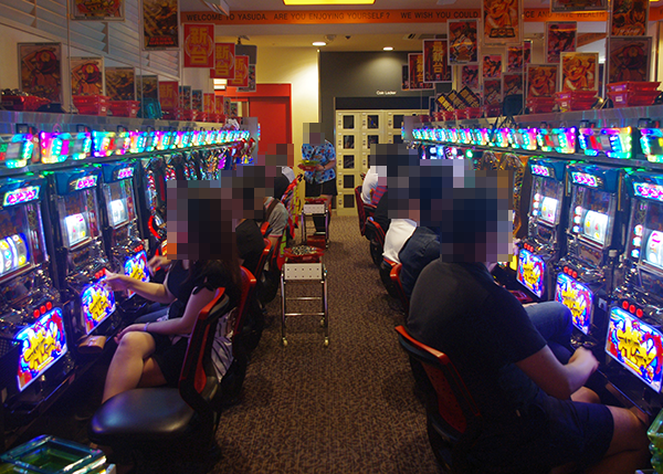15時を過ぎた頃の20円パチスロでは、「バジリスク~甲賀忍法帖~絆」と「沖ドキ!」が大人気。高稼働となっているだけでなく、華麗なパフォーマンスを披露するプレイヤーも目立っていた。