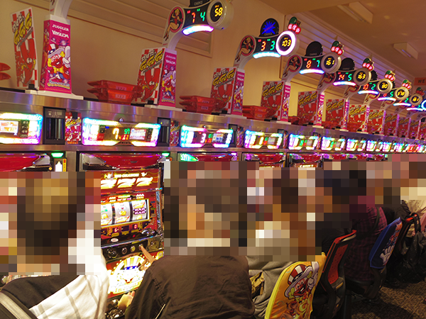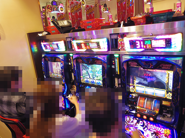 午後の20円パチスロでは、「バジリスク~甲賀忍法帖~絆」がとくに盛況。満足げな表情をみせていたプレイヤーは、機種の性能をうまく引き出していたことだろう。