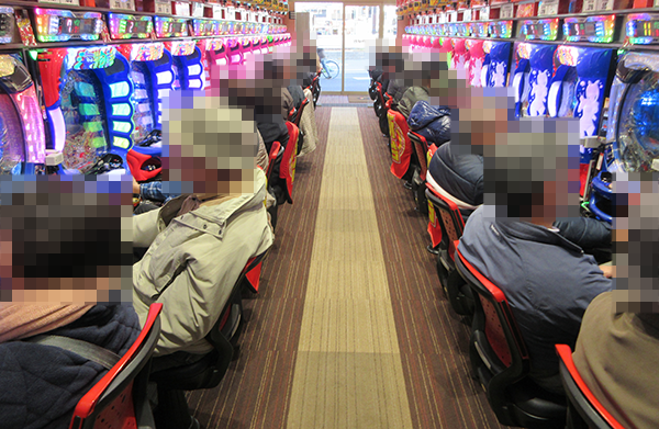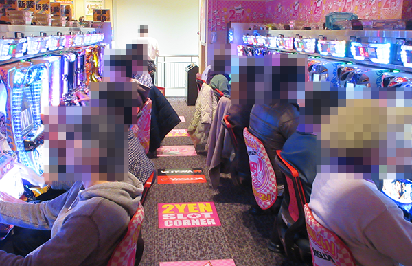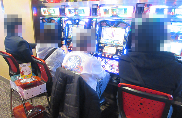 午後の20円パチスロでは、「バジリスク~甲賀忍法帖~絆」や「沖ドキ!」が盛況。明るい表情で遊技を楽しむ姿がみられた。
