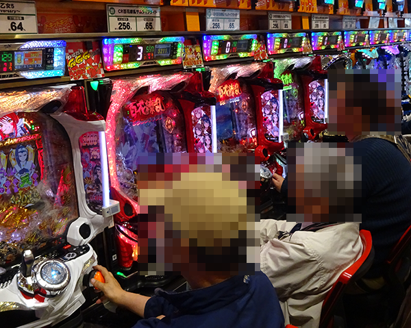 午後の4円パチンコでは、「CR百花繚乱 サムライブライド」などが人気。パフォーマンスを披露する姿からは、満足感を得られていることが伝わってきた。