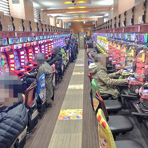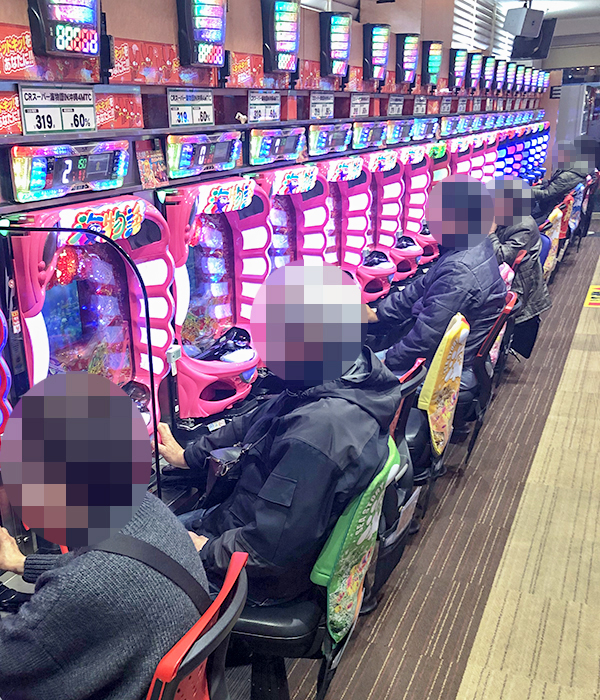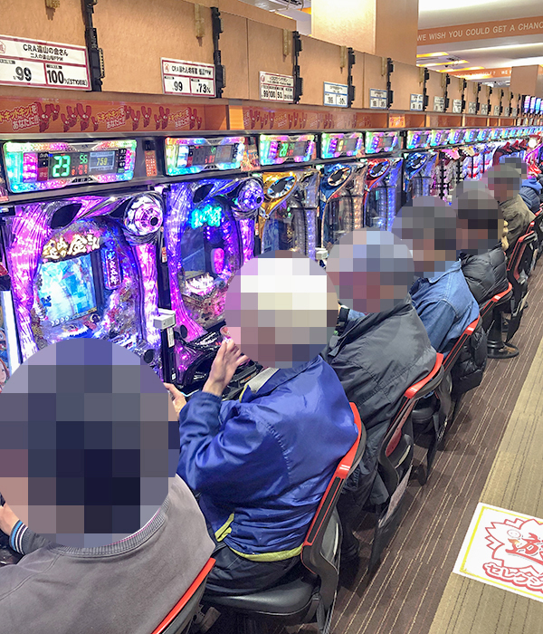 取材時の店内には既に多くのプレイヤーが集結し、パチンコ・パチスロを問わずにぎやかな状況となっていた。