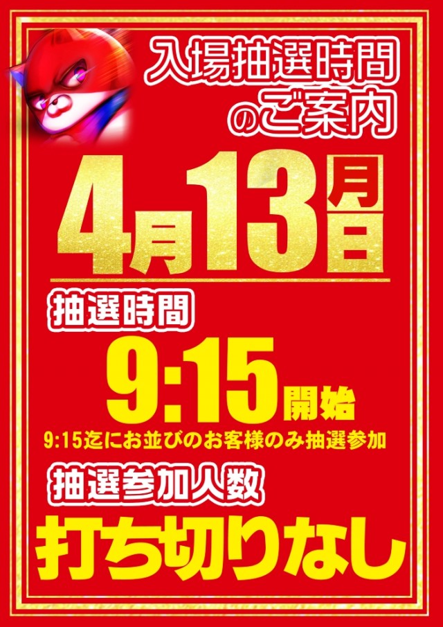 9:30より入場順番決め。9:50再整列後10:00より入場開始致します。ご不明な点はお気軽にお問い合わせ下さい。 |