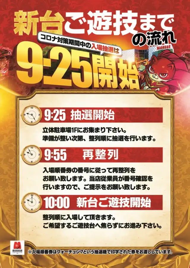 当日の朝9:25までに立体駐車場1Fエレベーター前にお並び頂いたお客様を対象に9:30より入場順番決め。9:55再整列後10:00より入場開始致します。ご不明な点はお気軽にお問い合わせ下さい。 |