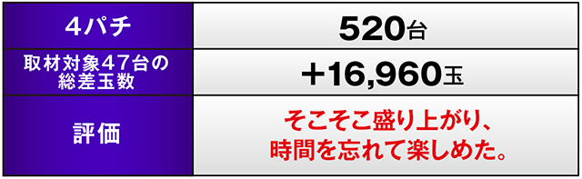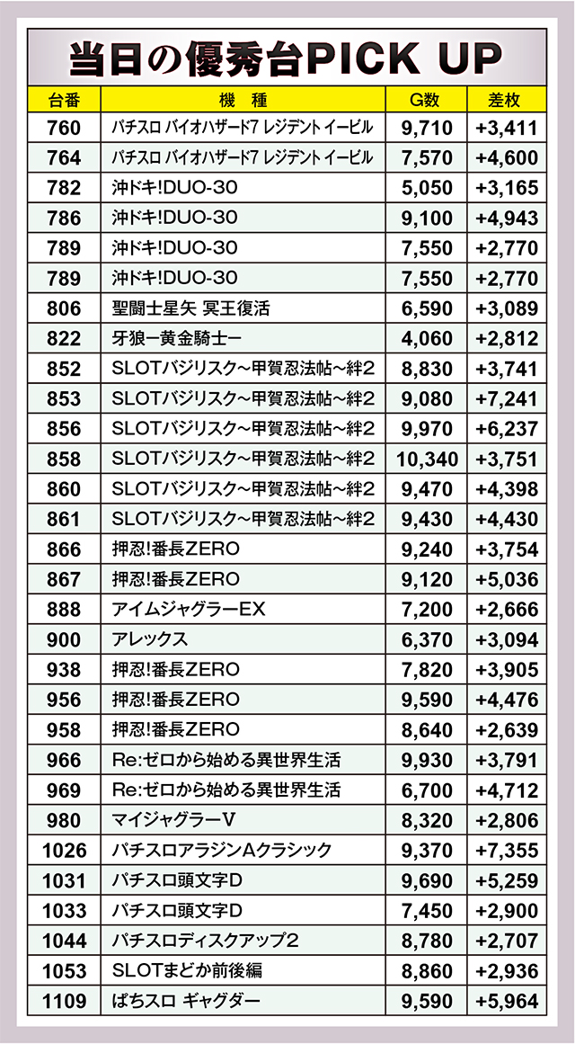 今回、久々に20スロ総差枚はマイナスとなってしまったが、優秀台の痕跡は多数目撃することができた。また取材対象機種の結果を見る限り、パチンコも十分満足できる内容であった。今後もまだまだ我々を楽しませてくれるのは間違いなさそうだ。