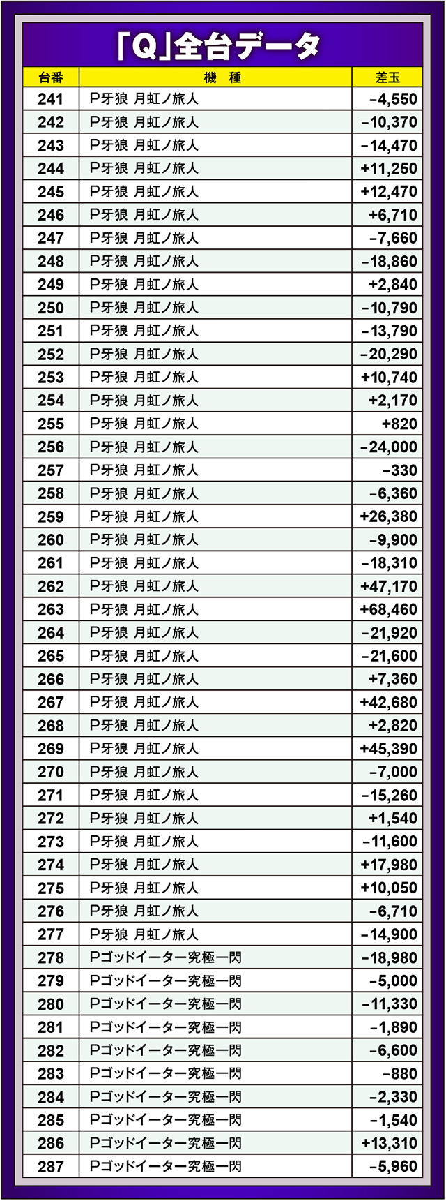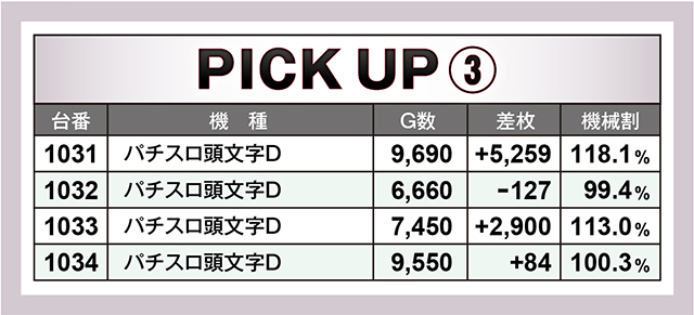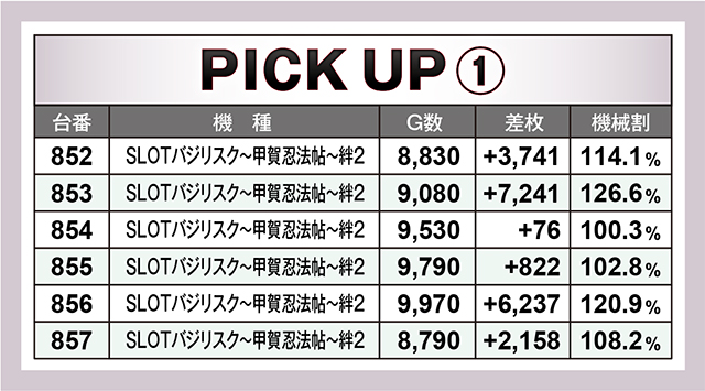 前回11台並びで好記録を連発させていた『SLOTバジリスク~甲賀忍法帖~絆2』。驚くことに今回も11台全台が優秀台を思わせる良挙動を示していたのである。また勝率は5割ながらも、平均+2,029枚を実現した『パチスロ頭文字D』も全台系だった…!?