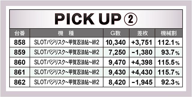 今回も取材班の予想通り、3,000枚オーバー記録が多発。特に常連さん人気の高い機種から多く生まれていたわけだが、実は意外な機種からも5,000枚超えが生まれていた。『ぱちスロ ギャグダー』から6,000枚に迫る悶絶記録が、そして『パチスロアラジンAクラシック』からは7,000枚を超える超絶記録が生まれていたのである。そして今回も『SLOTバジリスク~甲賀忍法帖~絆2』が…!