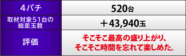 「マルハン千葉北店」における「ヒーローズレポート」の結果は、総差枚数+38,0725枚・総差玉数+43,940玉となっている。ともに快勝する気持ちの良い結果となっていて、ファンの満足度も高かった。ここまで不調を見せることなく4連続のダブルを達成していることから、ますます同店に対する期待度が高まったのではないだろうか?心地良いプレッシャーに応えるべく、これからもしっかりと結果で魅せてくれることは間違いないため、同店の動向から目を離してはならない…!