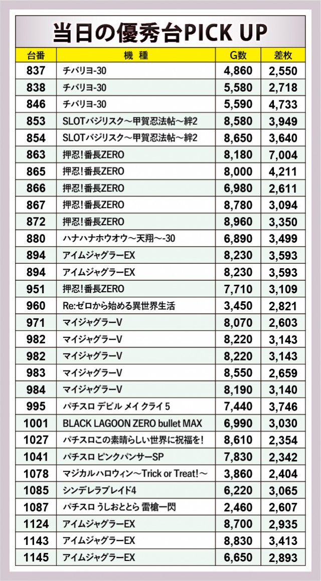 『押忍!番長ZERO』『アイムジャグラーEX』『マイジャグラーV』の名前が多く名を連ねており、やはり人気機種群が中心となって活躍していた1日だった。『押忍!番長ZERO』863番台+7,004枚や、『アイムジャグラーEX』1143番台+3,413枚といった記録が見られ、しっかりと熱気を放っていたのが分かる。負けじと『パチスロ デビル メイ クライ 5』『BLACK LAGOON ZERO bullet MAX』も3千枚OVERを達成し、設置されている機種のいずれもが奮闘していたのが印象的だ。