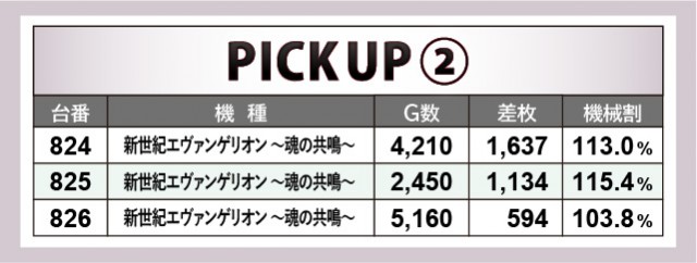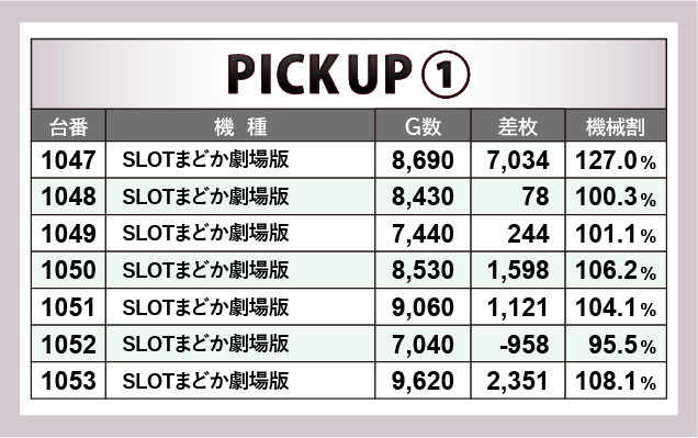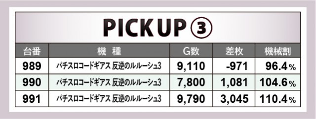 人気機種群が活躍する一方で、機種単位で輝きを放つ3機種があった。『SLOT劇場版 魔法少女まどか☆マギカ[前編]始まりの物語/[後編]永遠の物語』1047番台+7,034枚・『新世紀エヴァンゲリオン 〜魂の共鳴〜』824番台+1,637枚・『パチスロコードギアス 反逆のルルーシュ3』991番台+3,045枚と、それぞれが盛り上がりをリードしていたのが鮮烈であるばかり。全台系として確かな打ちごたえがあったのは間違いなく、遊技していたファンは有意義な時間を過ごしていたことだろう。