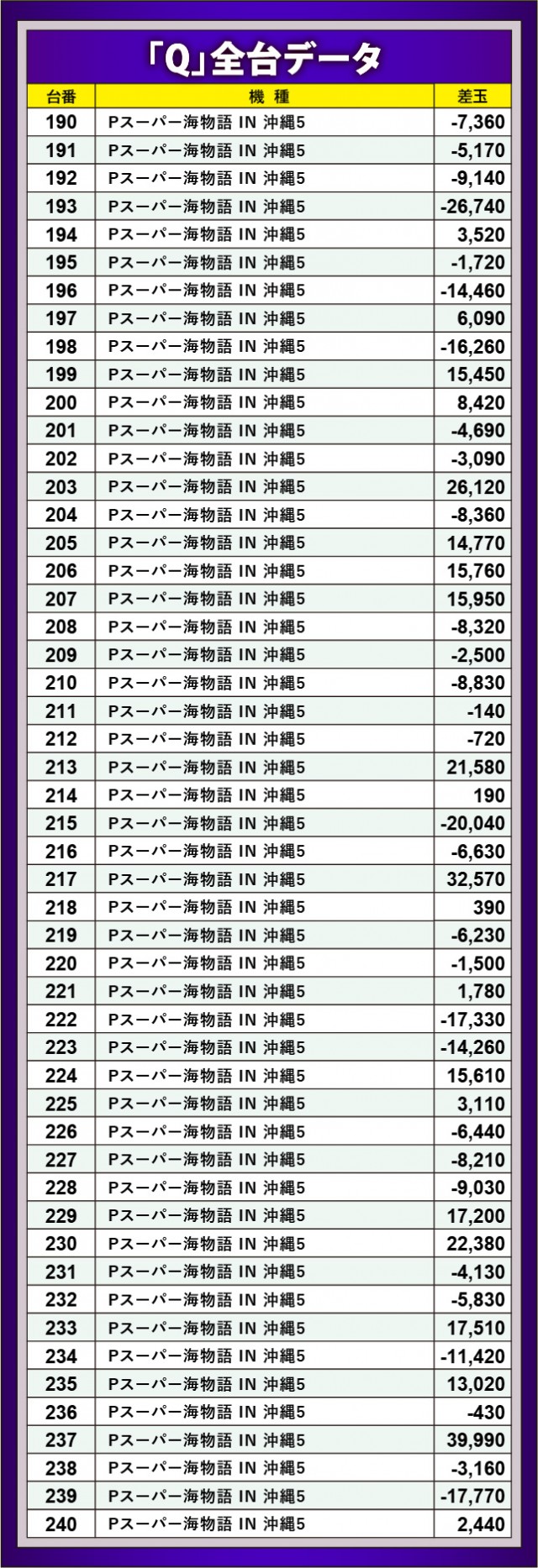 老若男女問わず愛される『Pスーパー海物語 IN 沖縄5』は、各台で万発OVERを達成するだけでなく、2~3万発OVERを披露するなどの好調ぶりを見せていた。特に輝かしい活躍だったのは237番台+39,900玉という記録で、惜しくも4万発を超えなかったのが悔やまれる。島にハイビスカスフラッシュの心地良い音が鳴り響き、遊技していたファンは南国さながらの雰囲気に心が躍っていたに違いない。