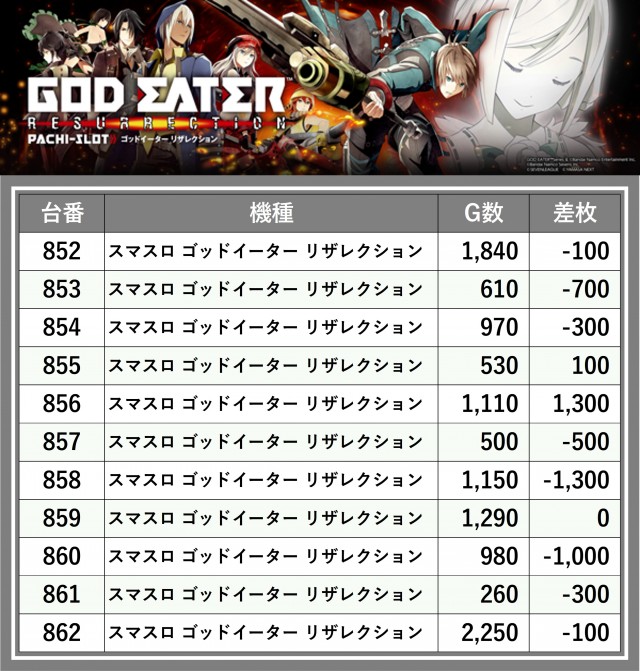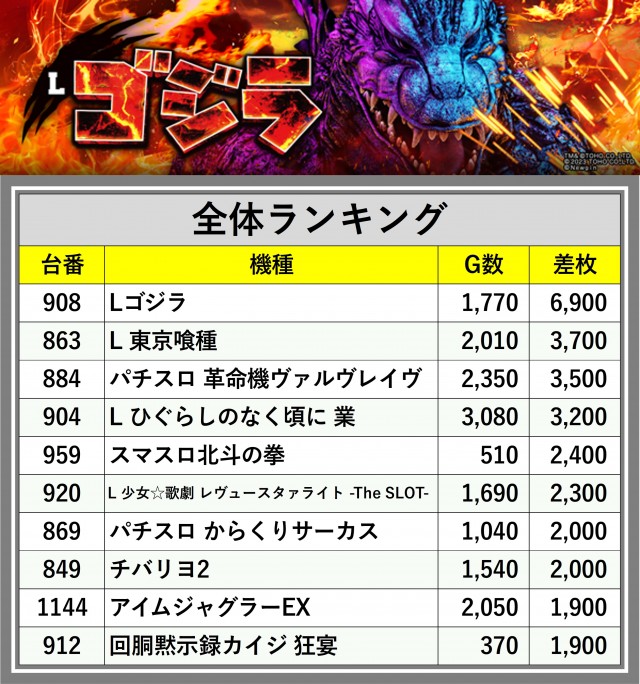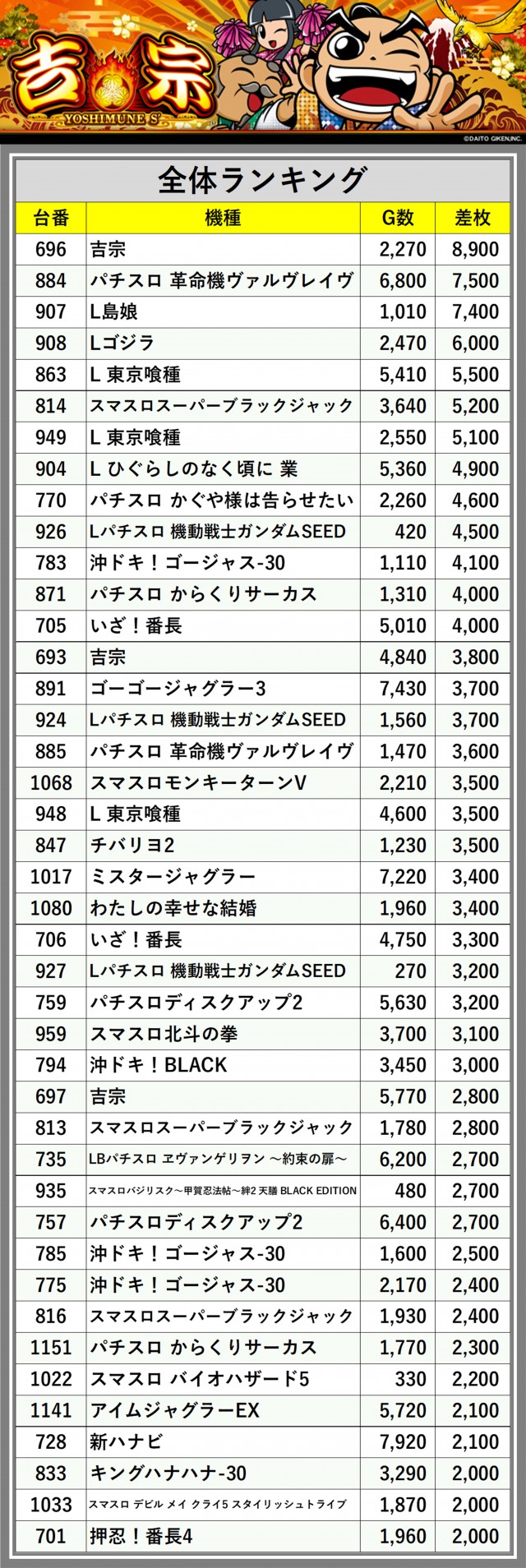 厳選された取材対象機種をはじめ、その他スロット全体から好記録が飛び出した!プレイヤーが楽しんだ1日を下記データにて振り返ってみて欲しい。