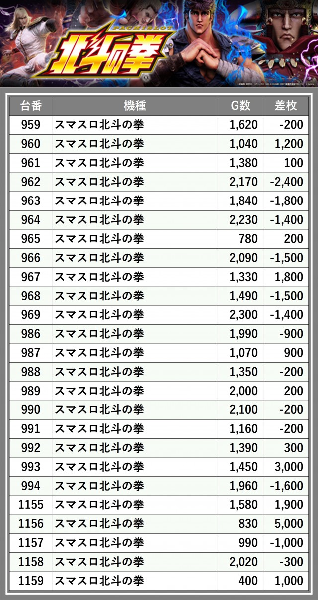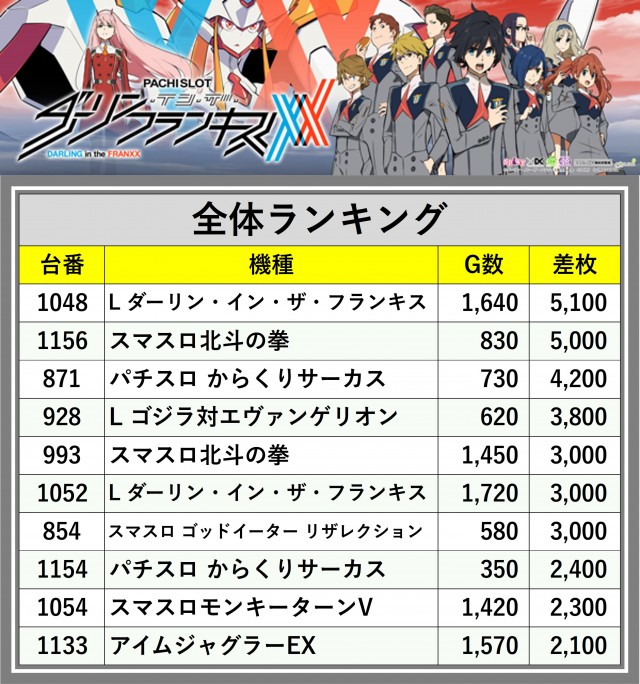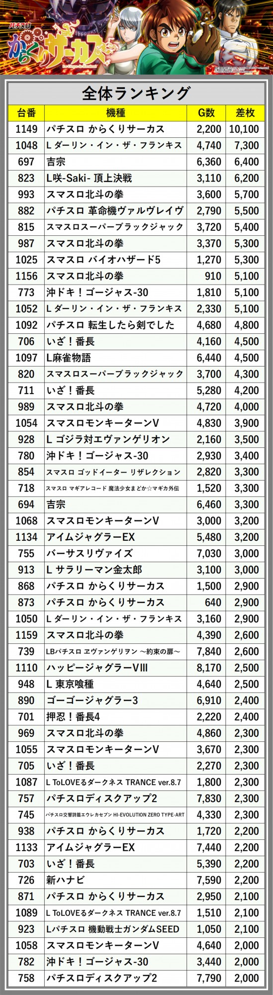 ※差枚数順に掲載しています
