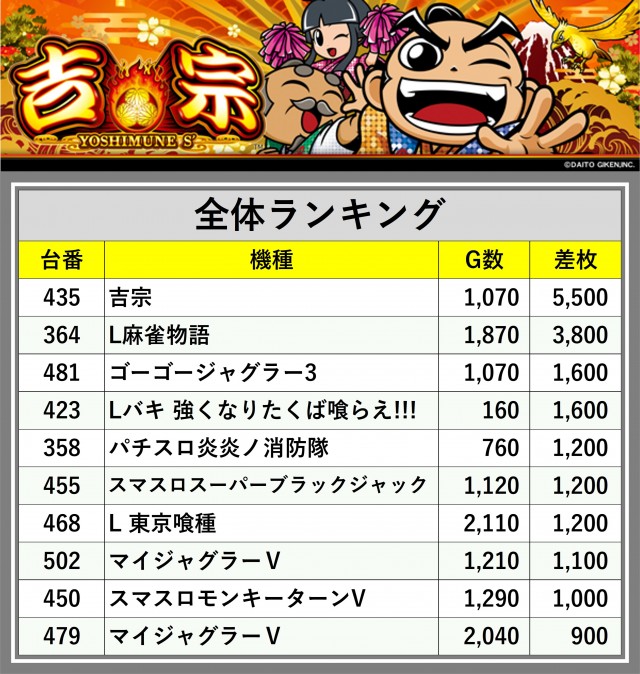 厳選された取材対象機種をはじめ、その他スロット全体から好記録が飛び出した!プレイヤーが楽しんだ1日を下記データにて振り返ってみて欲しい。
