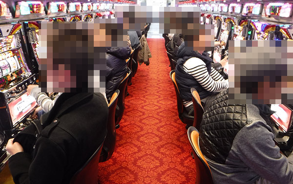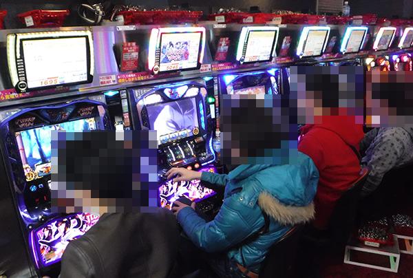14時半をまわる頃のパチスロでは、朝から注目を受けている「バジリスク~甲賀忍法帖~絆」とジャグラーシリーズが大盛況。