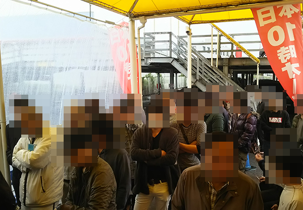 初日となった8日は、悪天候にもかかわらず、およそ90名のプレイヤーが集合。整列場所には屋根があるため、雨に打たれることなく、開店までの時間を過ごせていた。