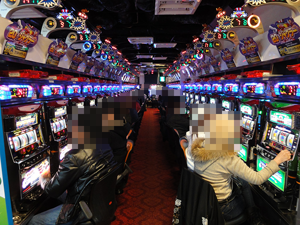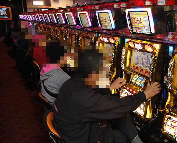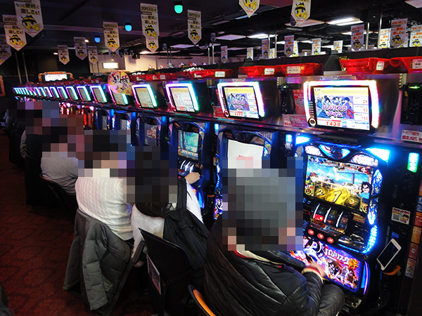 「ファンキージャグラー」や「ハッピージャグラーVⅡ」がほぼ満席となっており、ホール内でもひときわ目立つ存在となっていた。