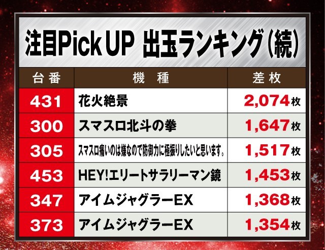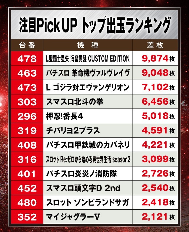 また、その他の機種では『L ゴジラ対エヴァンゲリオン』の+7,102枚、『スマスロ北斗の拳』の+6,456枚など、様々な機種からハイスコアが発生しており、広範囲に渡ってチャンスが潜んでいたのは間違いないだろう。