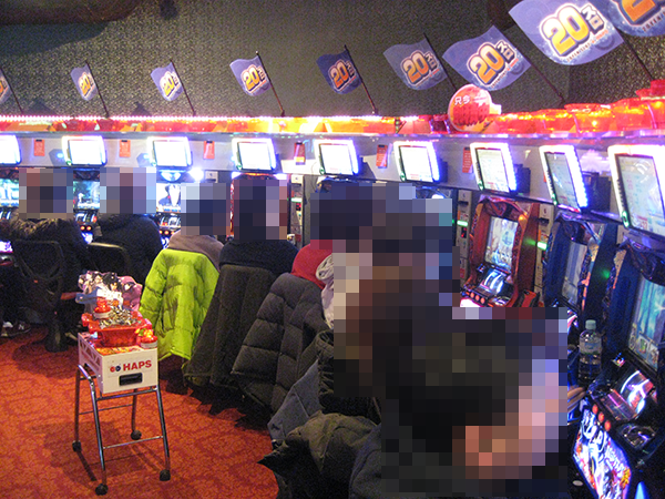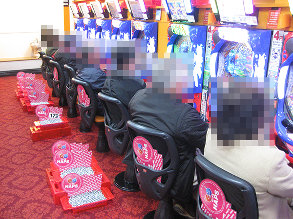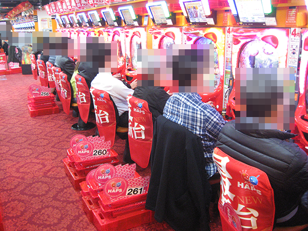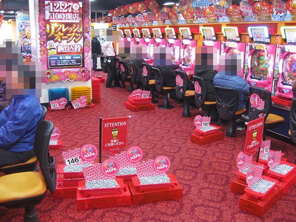 12月28日の「ハップス市川駅前店」は、平日とは思えない盛り上がりよう。いつもと同様にナイスな衣装に身を包んだスタッフたちの活躍もあり、ホール全体が活気に包まれていた。